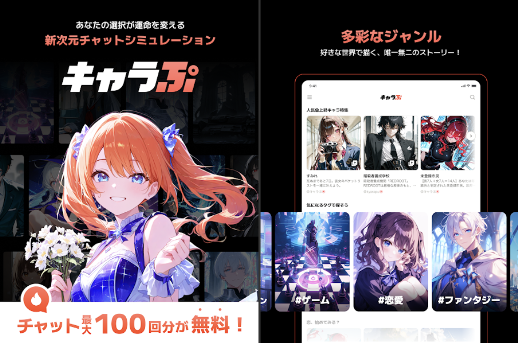「キャラぷ」は多様な「AIキャラクター」とチャットを楽しめ、会話の内容や選択肢によって無限にストーリーが展開する没入感のあるAI会話アプリです。