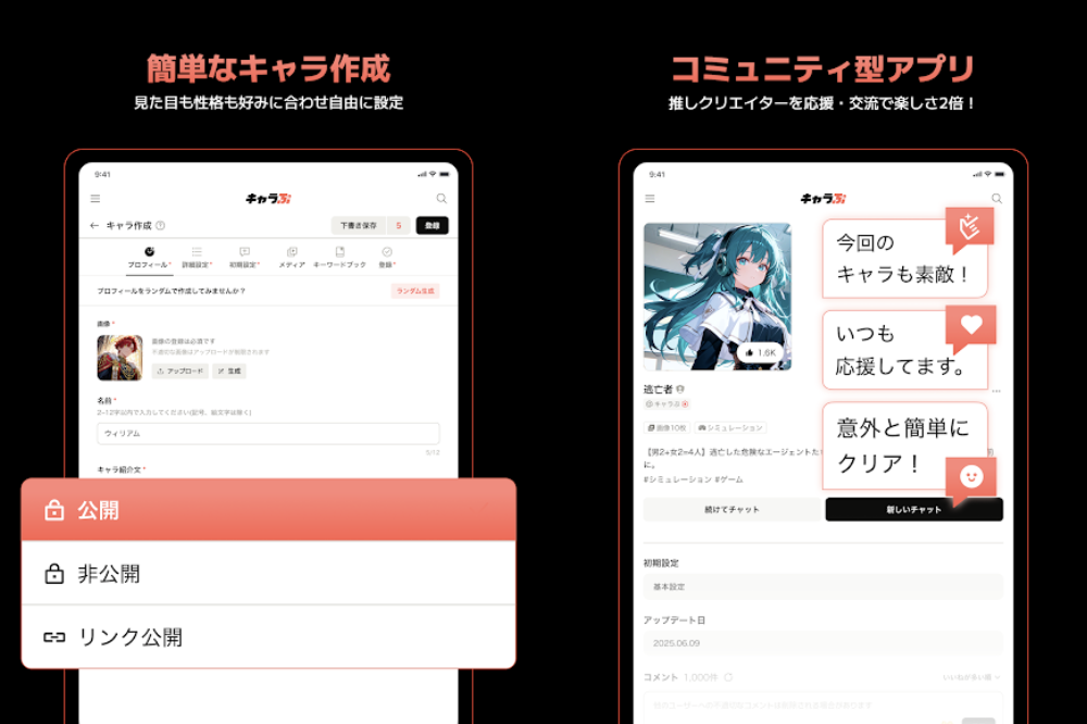 作ったキャラは公開して他のユーザーと共有したり、非公開でひとりだけの世界を楽しんだりもOK。「理想」をカタチにして、自分だけの世界を発信できます。