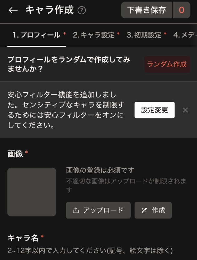 自分でオリジナルのキャラを作ってみましょう。キャラを作成する場合に「画像」の登録は必須になります。