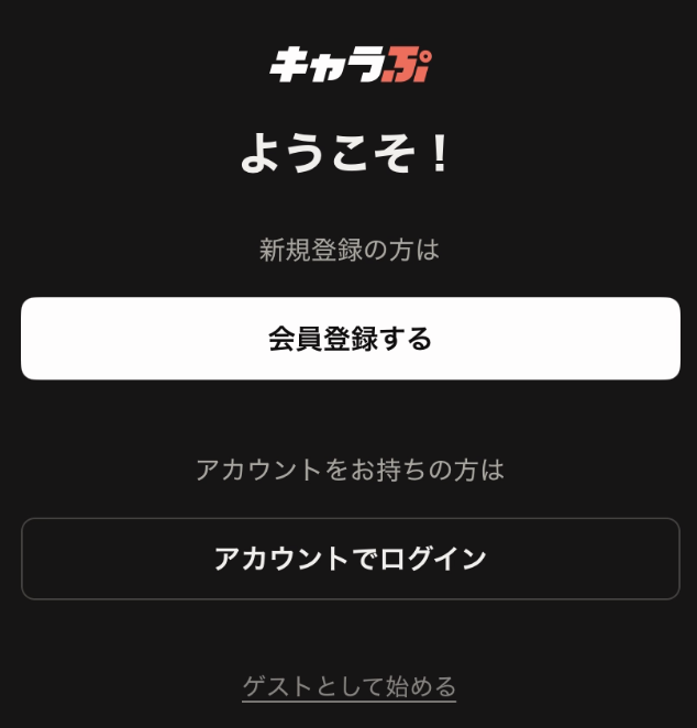 アカウント登録したくない人は「ゲストとしてはじめる」も選択できますが、その場合、「キャラぷ」の機能の一部しか使えません。