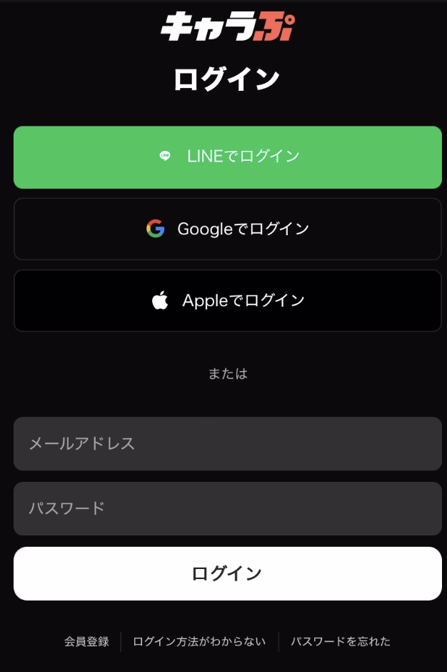 「会員登録」は「LINE」「Google」「Apple」「メールアドレス」を選択できます。「メールアドレス」を選択する場合は画面左下にある「会員登録」をタップします。