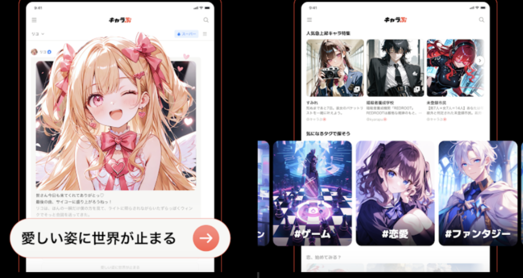 ただ会話ができるAIアプリではなく、オリジナルキャラを作成して共有したり、ビジュアルノベルも楽しめる「創る」「遊ぶ」「広げる」自由度の高い、コミュニティ型チャットが楽しめます。