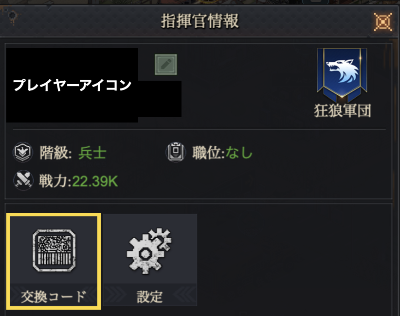 ②「指揮官情報」→「交換コード」を選択