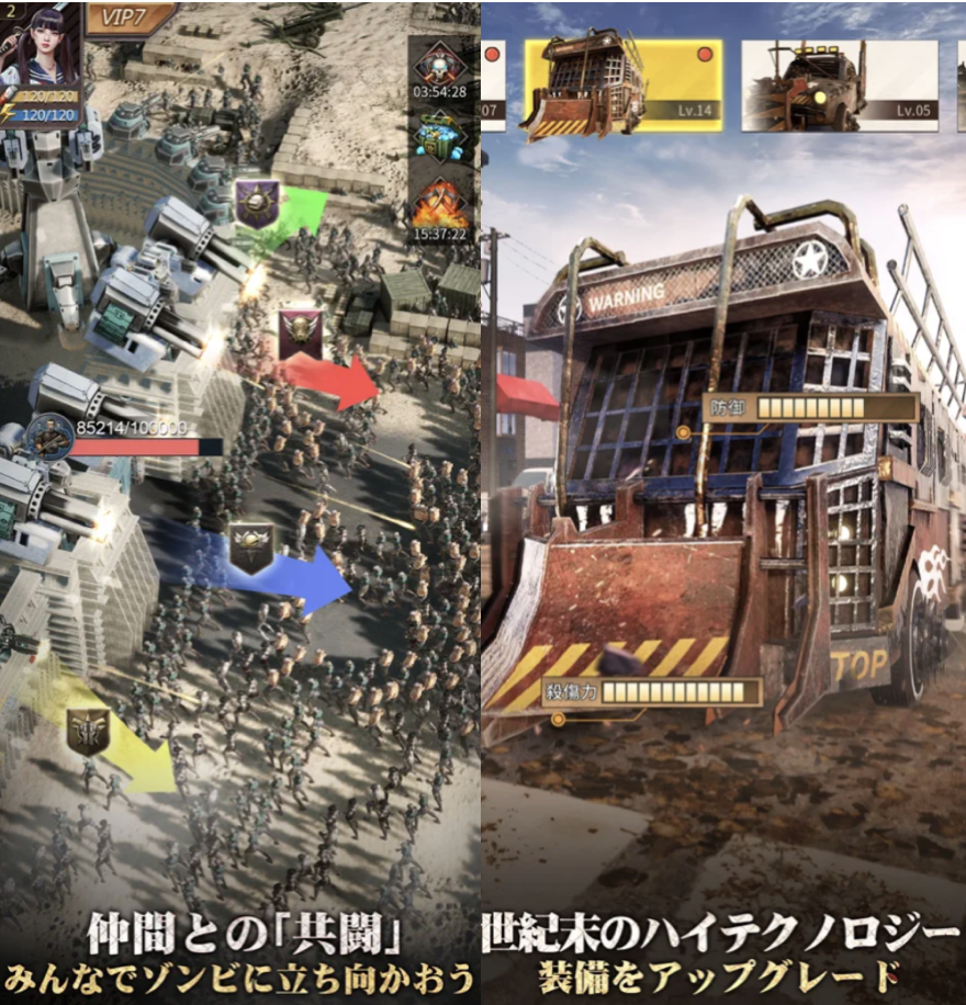 プレイヤーは基地を再建し、領土を拡大しながら兵器を開発アップグレードしてゾンビを倒していきます。