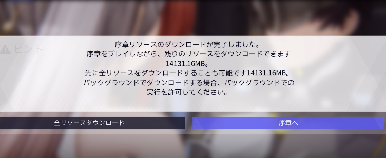 容量は大きいのですが、これをダウンロードするととりあえず全リソースをダウンロードできます。なお、ここでダウンロードすると、かなり時間を待たされるのですが、序章をプレイしながらプレイすると、体感的にはストレスありません。