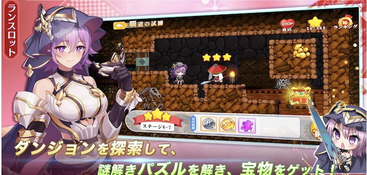 横スクロールマップのダンジョンや、キャラの好感度を上げてストーリーを解放したり、城に施設を建設したり・・・