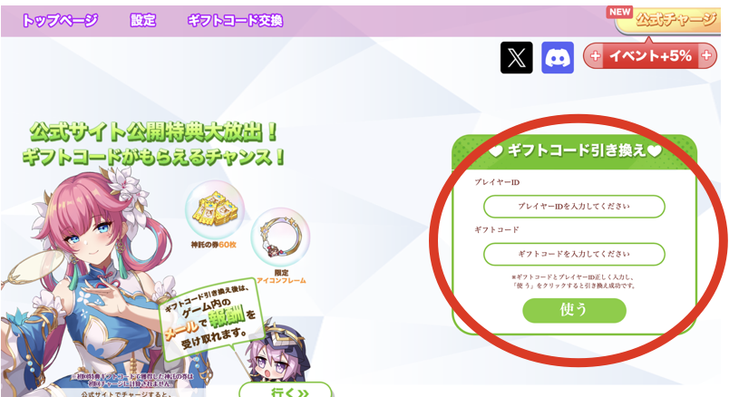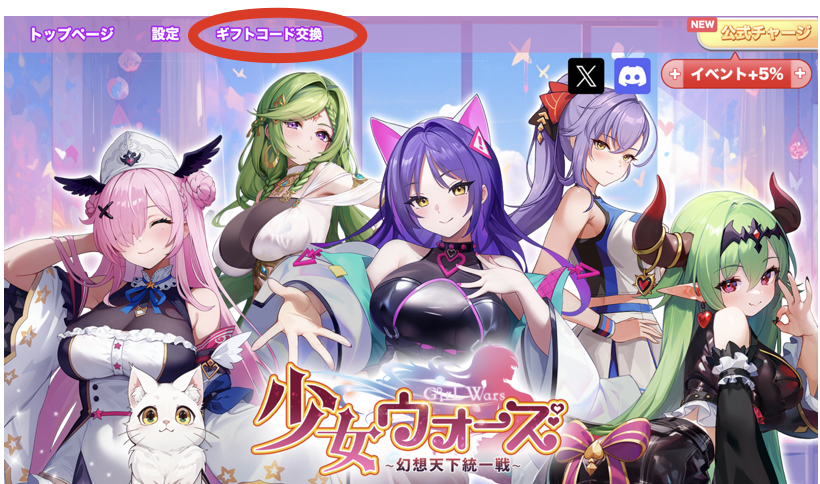 少女ウォーズの公式サイトにアクセスして、「ギフトコード交換」を選択します。