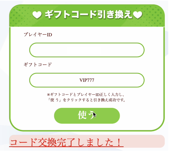 有効なコードを入力した場合は「コード交換完了しました!」と表示されます。