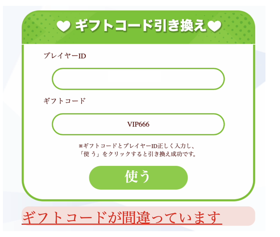無効ななコードを入力した場合は「ギフトコードが間違っています」と表示されます。