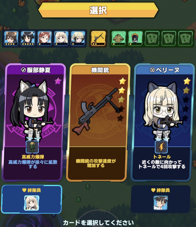 エネルギーが溜まるとサバイバー系ゲームによるある「スキル選択」「武器選択」「新しい仲間のウィッチ」の召喚が可能になります。