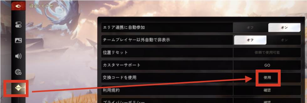 ③設定の中にある菱形アイコンを選択して交換コードの項目の「使用」を選択