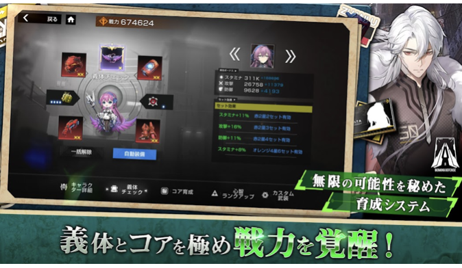 強化のメインになる「コア」を集めて合成し、キャラクター「義体」にセットすることでキャラクターの潜在能力は解放されていきます。