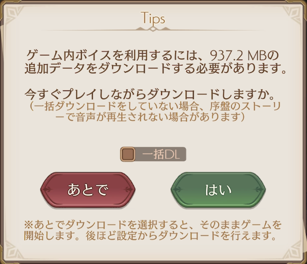 その後、ゲーム内ボイスの一括ダウンロードができます。ここでダウンロードしなくてもプレイできますが音声は再生されません。後ほどまとめてダウンロードできるのですが、ここで一括ダウンロードを選択します。