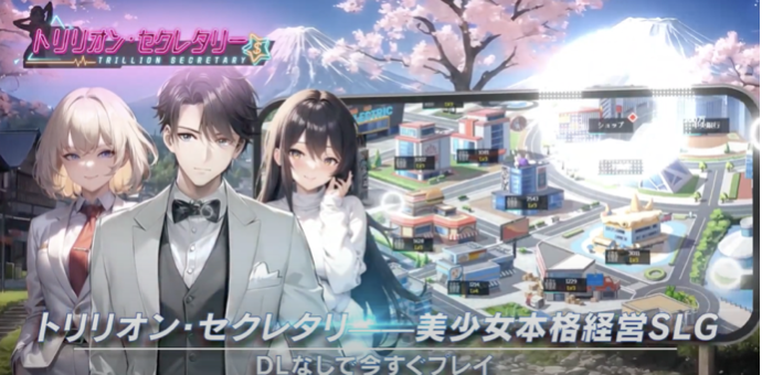 放置で収益を上げつつ、育成、経営、対戦で会社を大きくしていく経営×秘書マネジメントゲームです。